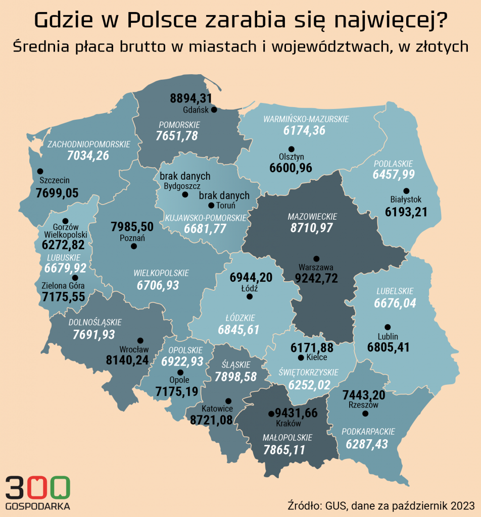 Де найвищі зарплати? Розмір зарплати в Польщі залежить не тільки від сфери, а й від місця проживання. Тож регіон також впливає на зарплату. За даними GUS, у грудні 2024 року найвища середня зарплата брутто була зафіксована в Кракові (10678,90 злотих), Гданську (10640,10 злотих) і Варшаві (10456,10 злотих).
