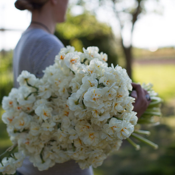 Narcissus Sir Winston Churchill has white petals with a small orange / yellow center. This beautiful daffodil is one of the most fragrant daffodils.