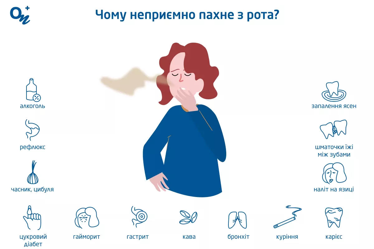 Причини поганого запаху з рота Наліт на язику, шматочки їжі, що застрягли між зубами або в кишенях з ясен, — це наслідок поганої гігієни і живильне середовище для мікроорганізмів, що поширюють смердючий запах. У більшості випадків позбутися галітозу допомагає лікування у стоматолога.