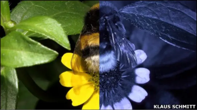 Бджола сприймає кольори інакше, ніж людина. Вона добре бачить білий, чорний, синій і жовтий, але не бачить червоний і зелений. Ці кольори розрізняють лише як ступінь білого або чорного кольору. Наприклад …