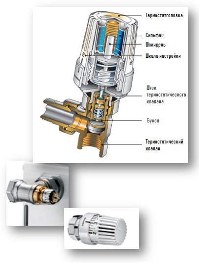Клапан регулює потік теплої води через радіатор, а від цього залежить, до якої температури нагріється опалювальний прилад. У клапані розташований рухомий шток, який, залежно від положення корпусу термоголовки, збільшує або зменшує прохід теплої води через радіатор.