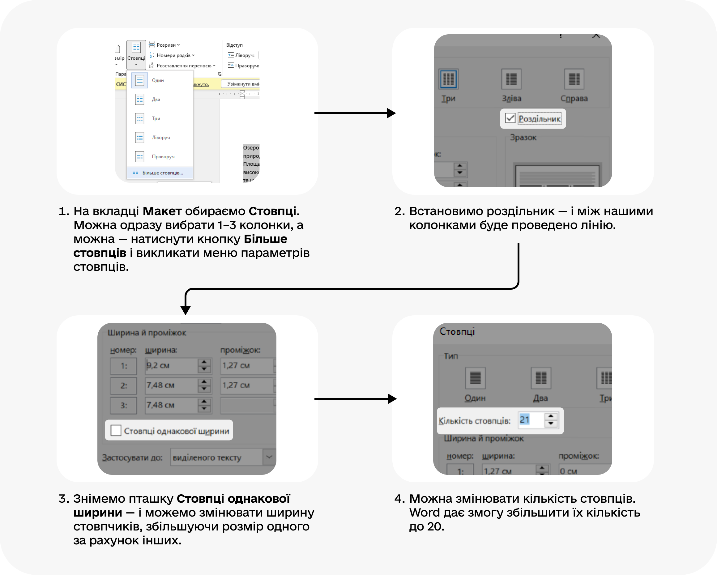 Для цього необхідно виділити фрагмент тексту, що має розташовуватись у колонках, та виконати наступні дії: Перейти на вкладку Розмітка сторінки. Натиснути на інструмент Стовпці. У списку, що відкриється, обрати потрібну кількість колонок (рис.
