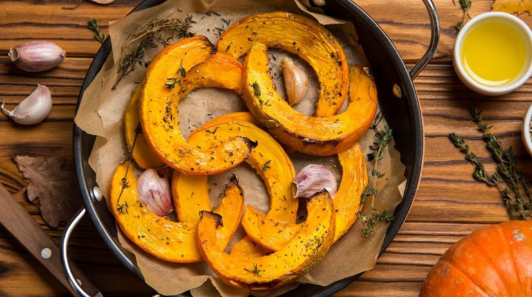 Запікати у духовці. У розігрітій до 200°C духовці готується гарбуз близько 25-35 хвилин (залежно від розміру скибочок та роботи духовки).