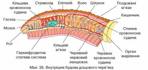 Травна система: кільчастих червів складається з ротової порожнини, глотки, стравоходу і кишечника, який закінчується анальним отвором. У дощових черв'яків є воло (розширення стравоходу). Перетравлювання їжі відбувається в кишечнику.